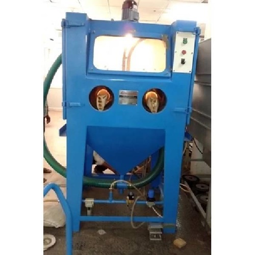 Mild steel sandblasting machine with 42 cfm capacity, boron nozzle, and 25 kg sand capacity. Ideal for rust particle removal. Includes 1 abrasive tank and wheels.