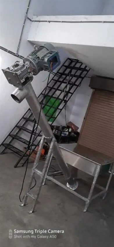 Vertical MS screw conveyor, 800 Kg capacity. Features 2-5 HP motor, 1400 RPM screw speed, 2.2 m3/h convey measure. Operates at 415V, three-phase.