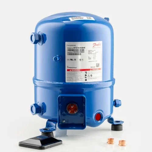 MTZ 28 JE4AVE reciprocating compressor, up to 5 HP motor power, using R404A refrigerant. 2.5 H/P production capacity, wooden box packed, Made in India.