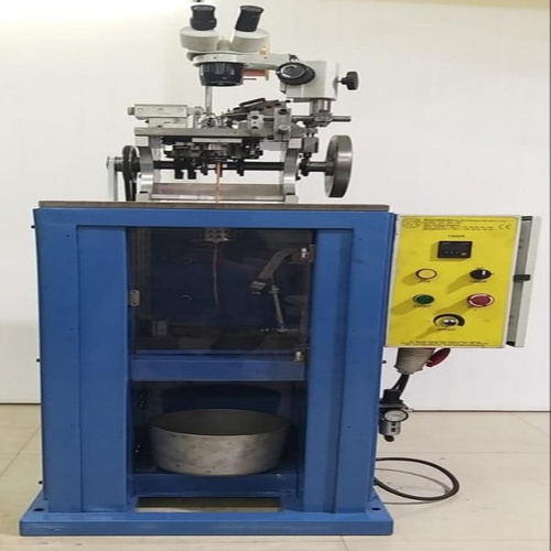 Fully automatic jewelry chain machine for gold and silver wire. Operates on 220V single-phase power, with 2kW consumption. Produces 1000mtr/hr. Includes oil tank, wooden packaging.