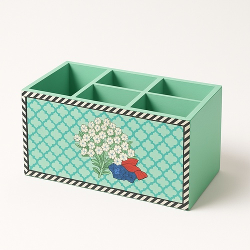 Rectangular wooden cutlery holder with a blue Mughal print. Features a Meena finish. Ideal for home use. Minimum order quantity of 50 pieces.