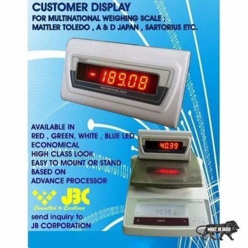 Plastic customer display with 220-240 V AC power. Features easy mounting and stand, available in Green, Red, White, and Blue LED colors for clear visibility.