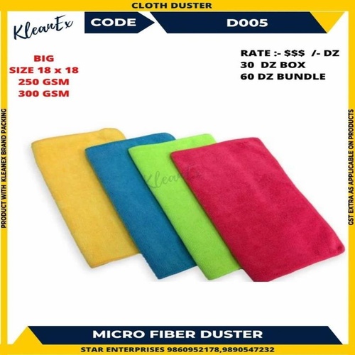 Microfiber cleaning cloths, available in red, blue, green, yellow, purple. Sizes 30x40 cm and 40x60 cm. 250-900 GSM. Made in India. Minimum order 500.