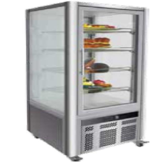 Panoramic cold showcase with 4 shelves and 468 Ltrs volume. Operates between 2-100°C with 280W input. Dimensions: 28x28x71 inches.