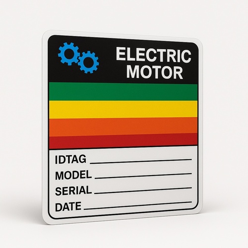 Durable multicolor labels for electric motors, asset identification, and boxes. Designed for clear marking and identification of equipment components and inventory.