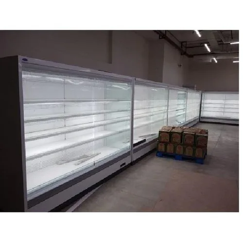 Stainless steel multideck open chiller machine. 220V voltage, 1060 Watts input power. This unit measures 5 feet in height.