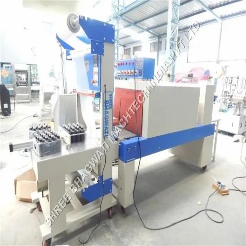 Semi-automatic GMP Model L-Sealer with shrink tunnel for bottles or jars. Made of stainless steel, 3-phase power, and offers 03-04 packs/min speed.