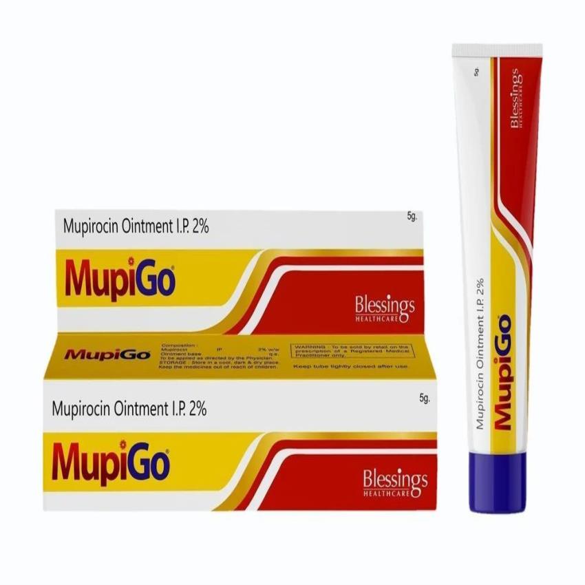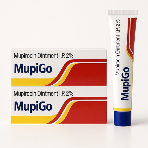 Topical antibiotic ointment for skin infections. Contains 2% mupirocin. Available in 5g tubes. 24-month shelf life. Manufactured in India.