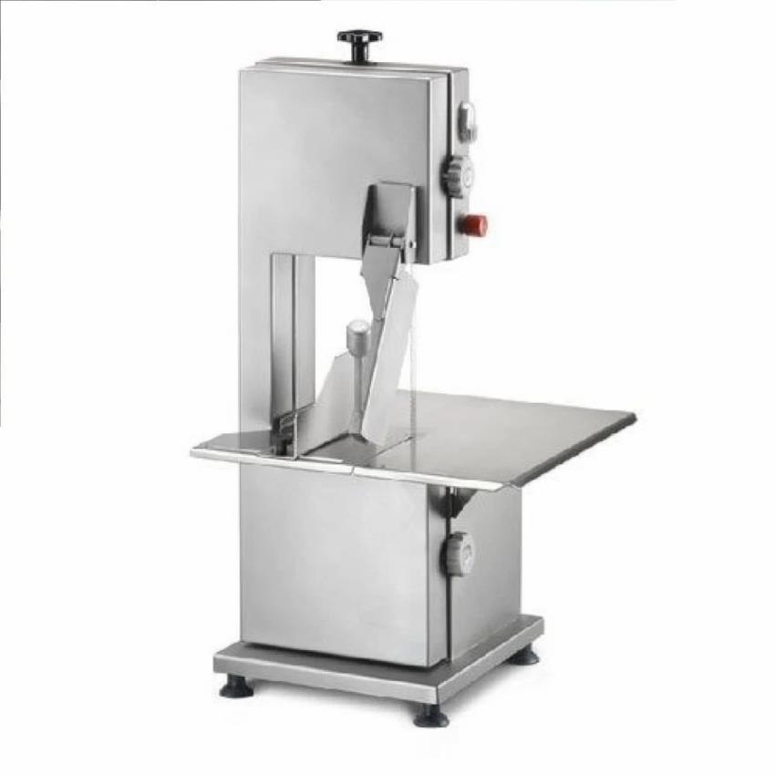 Commercial bone saw machine for mutton. Semi-automatic operation, stainless steel build, 50 kg/hr capacity, 1200-1650mm blade length, and 240V voltage. Weighs 60 Kg.