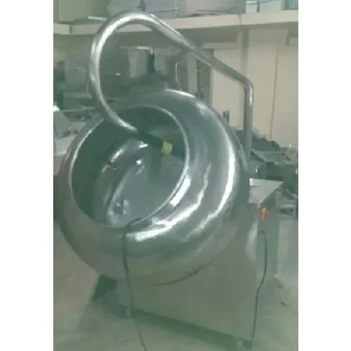 Commercial semi-automatic pan machine for namkeen flavoring. 50kg capacity, 100-200 kg/hr production. Ideal for food processing applications requiring flavor coating.