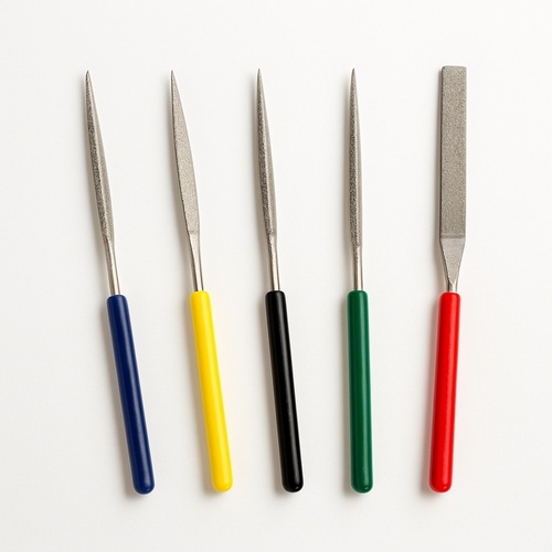 Nickel-coated diamond file for specialized custom applications. Features a diamond abrasive surface designed for precise cutting at a specific angle.
