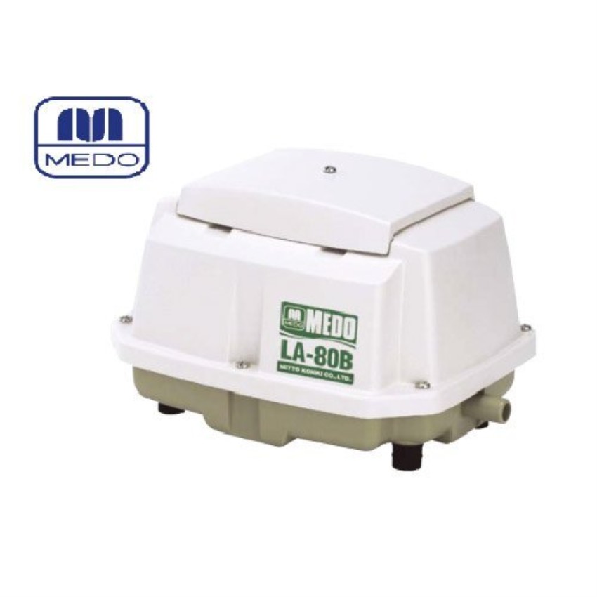 Plastic body aeration air blower (LA 80B). Features linear pump and centrifugal blower type, medium pressure, 230V electric operation. Lightweight and compact for industrial use.