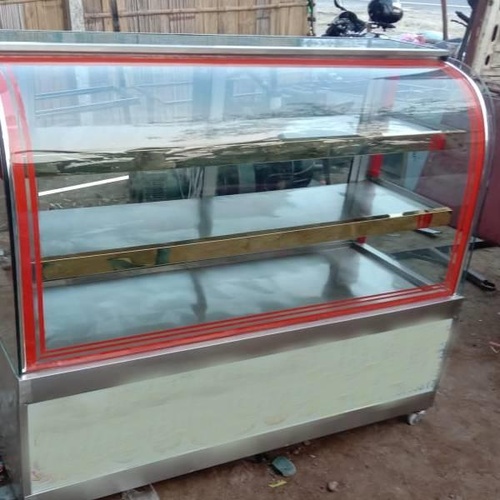 A non-air-conditioned display counter designed for commercial use. Features a stainless steel construction with four shelves for showcasing products effectively. Durable and functional.