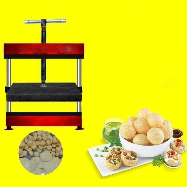 Manual pressing machine for pani puri and papad. Compact size (16x24) with a capacity of 500 per minute. Ideal for home or small commercial use.