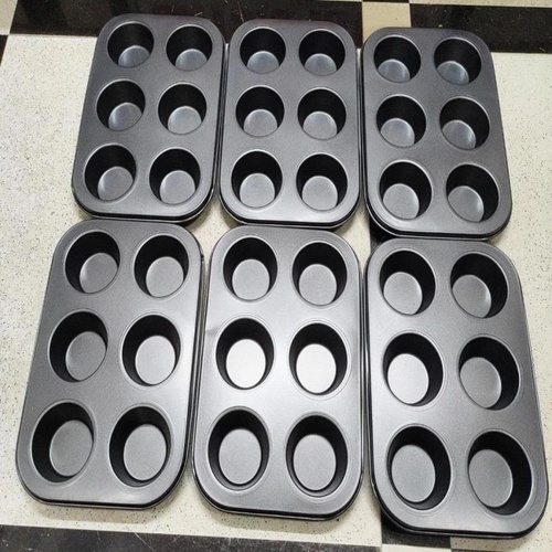 Black aluminium non-stick muffin tray, 6 cups capacity. Round shape, suitable for commercial use. Available in ready stock. Size: 6 pcs.