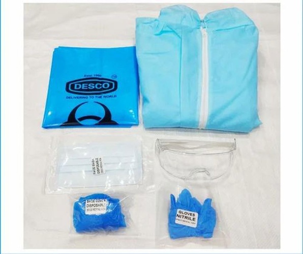 ISO certified blue nonwoven disposable PPE kit for unisex use in hospitals. Includes a coverall gown, made in India. Suitable for doctors and clinical staff.