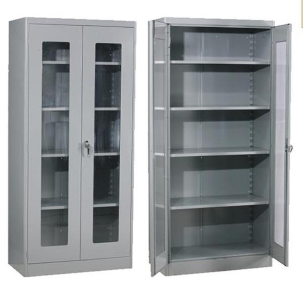 A 6-7 feet tall office display storage cabinet made of glass. Features 4 racks and 2 doors, designed in a rectangle shape for efficient office organization and presentation.