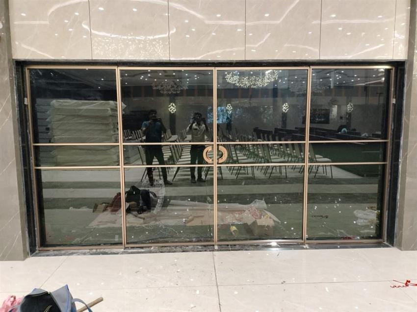 Slim partition door designed for office environments. Provides effective space division with a sleek profile. Durable construction for commercial use. Easy installation.