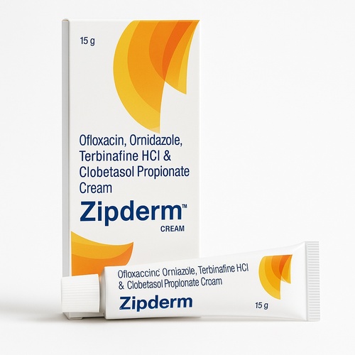 A 15 gm cream containing Ofloxacin, Ornidazole, Terbinafine HCI, and Clobetasol Propionate. This prescription medication has a shelf life of 18 months.