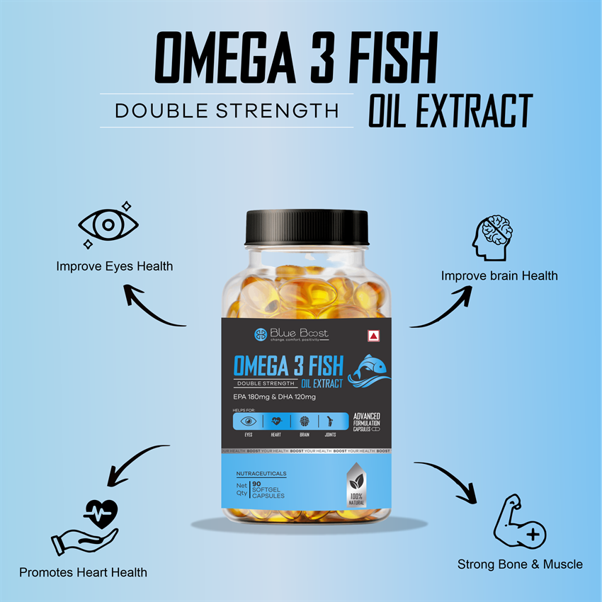 Double strength Omega 3 fish oil capsules with EPA 360mg and DHA 240mg. For eyes, heart, brain, and joints. 90-capsule box with a 36-month shelf life.