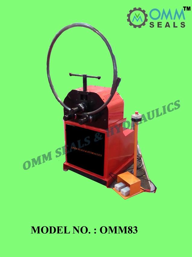 Semi-automatic 3-roller motorized pipe bending machine. Min 12mm diameter, max 350mm radius. 360-degree bend angle, horizontal layout. Handles 12mm to 2'' pipe.