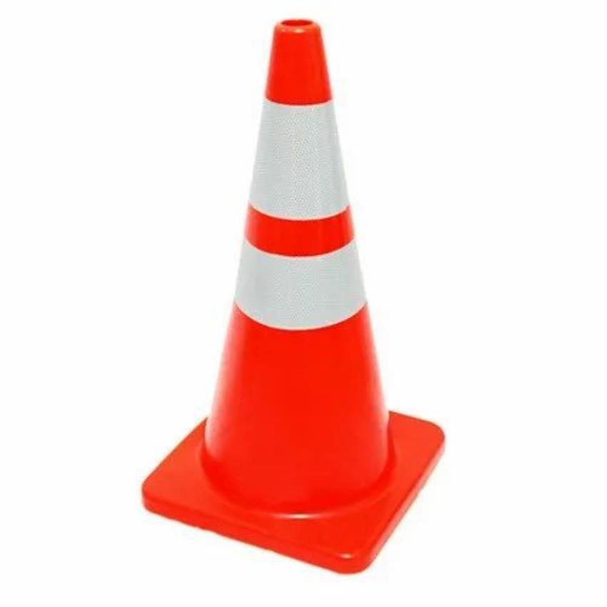 Orange, portable safety cones for road safety. Features flexibility and rotational capability. Available for customisation, offering versatile use in traffic management. New condition.