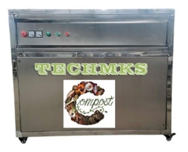 Stainless steel composting machine with 25-50 kg/day organic waste capacity. Features 220V, 50Hz, 3.5kW energy consumption, and automatic operation. Requires 2x2x3 mtr space.