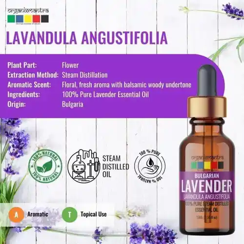 100% pure organic lavender essential oil, cold-pressed from flower petals. Ideal for cosmetics, skin care, and aromatherapy. Packaged in a 15ml bottle. Made in India.
