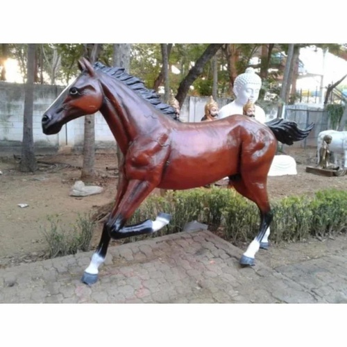 FRP horse statue for exterior garden decor. Available in multicolor with customizable dimensions (2-5 ft height). Made in India.