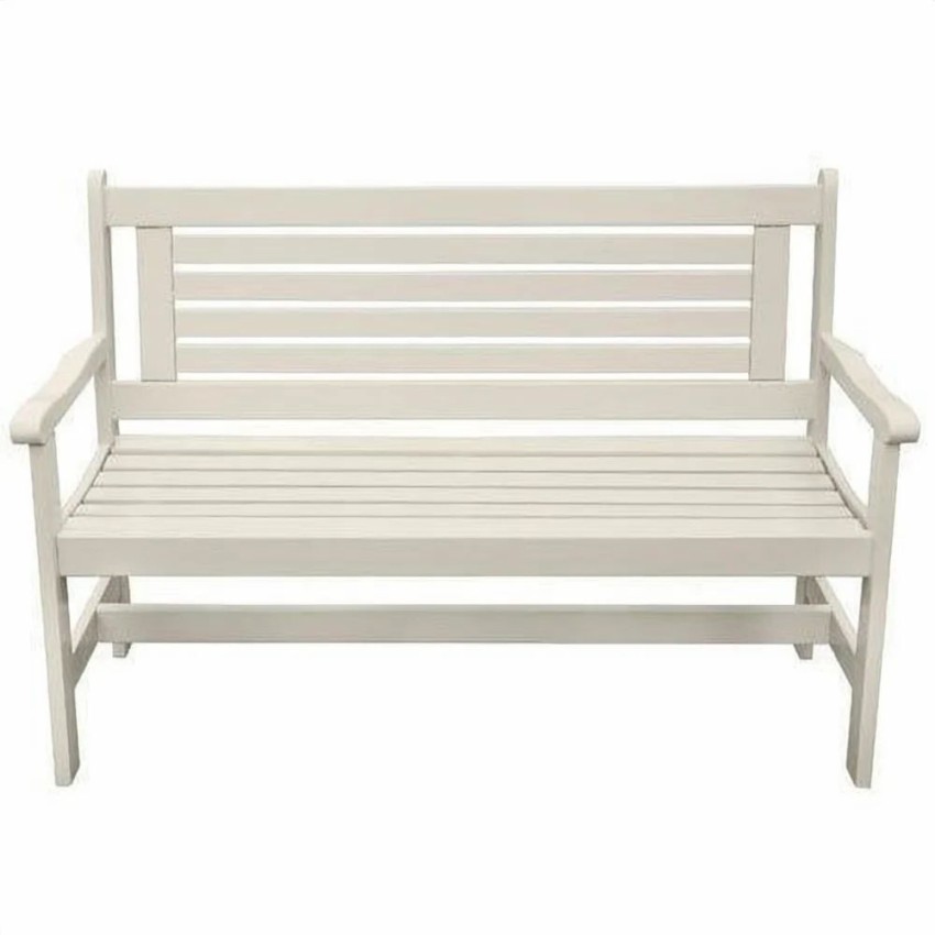 A 4-seater outdoor garden bench made of white wood. Features armrests and a back. Available in stock. Dimensions: 35 inch height, 18 kg weight.