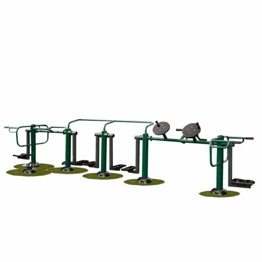Mild steel multi-activity outdoor gym equipment, 5500x1720x1170mm. Powder-coated finish, manual operation, non-portable. Ideal for parks and outdoor fitness areas.