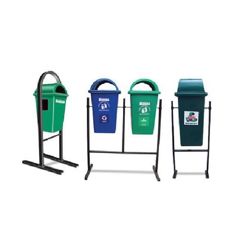 Plastic litter bins with a permanent metal frame structure for outdoor use. Height measures 1138 mm. Designed for durability and public spaces.
