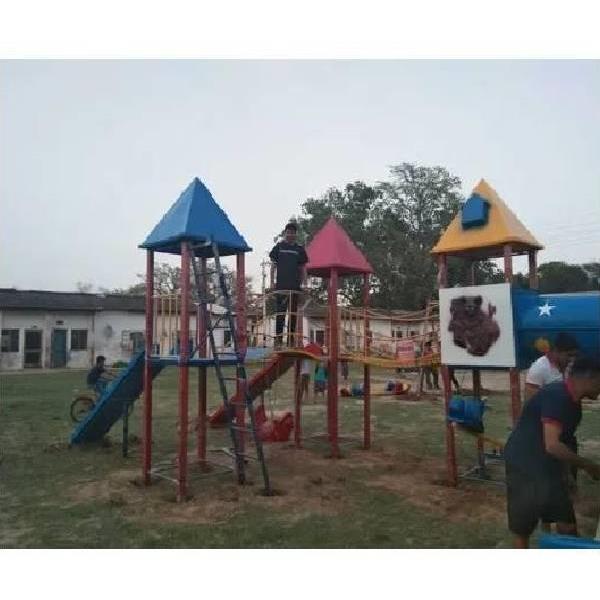 Iron and FRP outdoor play station for ages 6-12 years. Features a color-coated finish, ideal for playground applications with a large play area.