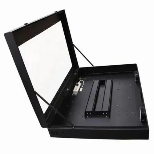Rectangular black SS outdoor enclosure with powder-coated surface treatment. Suitable for 55-inch panel production capacity. Made in India.