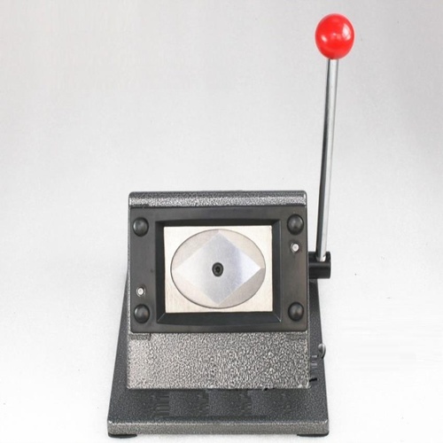 Grey oval die cutter for badge making. Manual operation, 39-31mm oval shape. Suitable for badges and events. Weighs 6.8 Kgs. Immediate delivery.