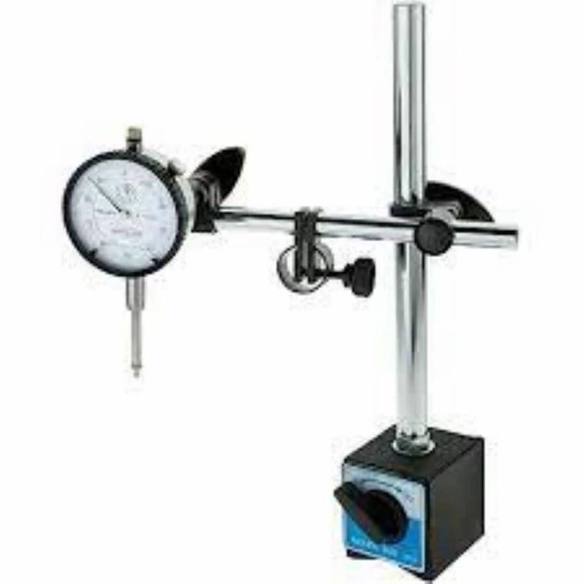 Oval-shaped iron dial gauge with a magnetic stand. Analog meter type with 0.01mm precision. Available in blue and grey.