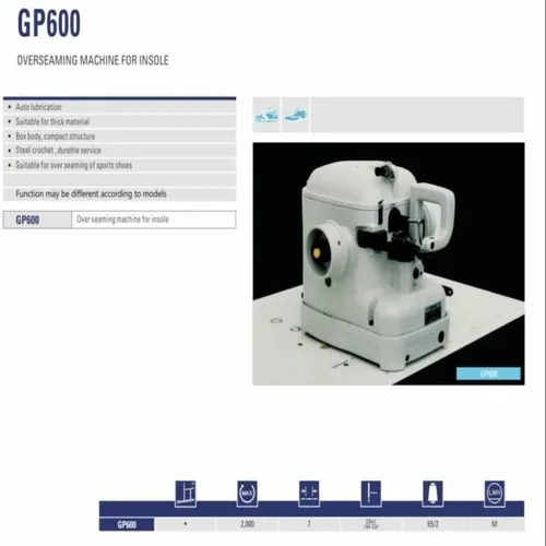 New, motor-operated overseaming machine for insoles. Features cast iron body, 1 needle, 1 thread, 250W power, and max sewing speed up to 3000 stitches/min. ISI certified with 1-year warranty.