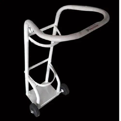 Stainless steel hospital oxygen cylinder trolley. Features powder coating, white color, 2 wheels, and portability. Designed for single oxygen cylinder load capacity.