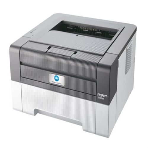 Konica Minolta Pagepro 1500W laser printer, 20 ppm speed. Features 8 MB memory, A4 paper size, and USB connectivity for monochrome output.