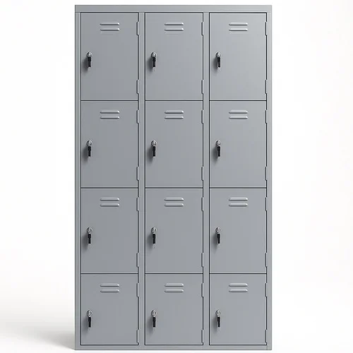 Grey, paint-coated stainless steel locker with 12 compartments. Rectangular shape, rust-proof, and durable for secure personal item storage.