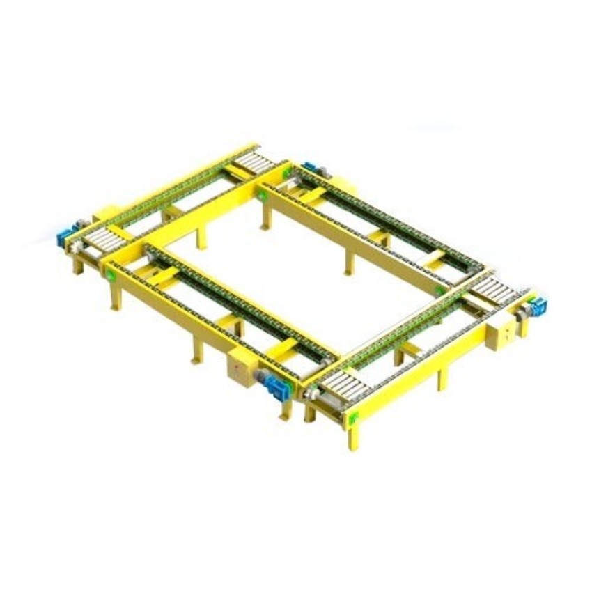Heavy-duty pallet handling conveyor machine designed for efficient material transport in industrial settings. Robust construction ensures reliability and longevity in demanding environments.