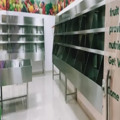 Stainless steel pallet racking type vegetable shelves for supermarket use. 7 feet height with a maximum load capacity of 1000 Kg per layer.