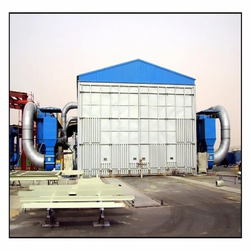Steel panel build blast room system for shot blasting. Features an abrasive recovery and re-cycling system. Available in automatic, semi-automatic, or manual operation. Material: Steel.