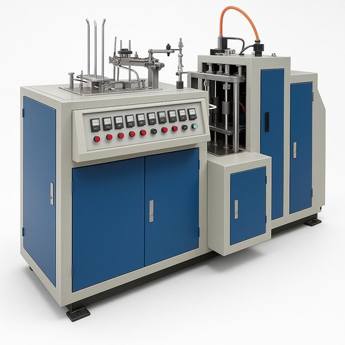 Automatic paper cup machine, 50 Hz, single phase electric power. Processes paper for 300ml cups. Made in India. Ideal for disposable cup production.