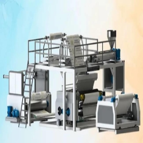 Paper extrusion lamination machine with 140kg/hr capacity. Uses 76 MM film core for paper and BOPP laminating film. Features pneumatic pressure adjustment.