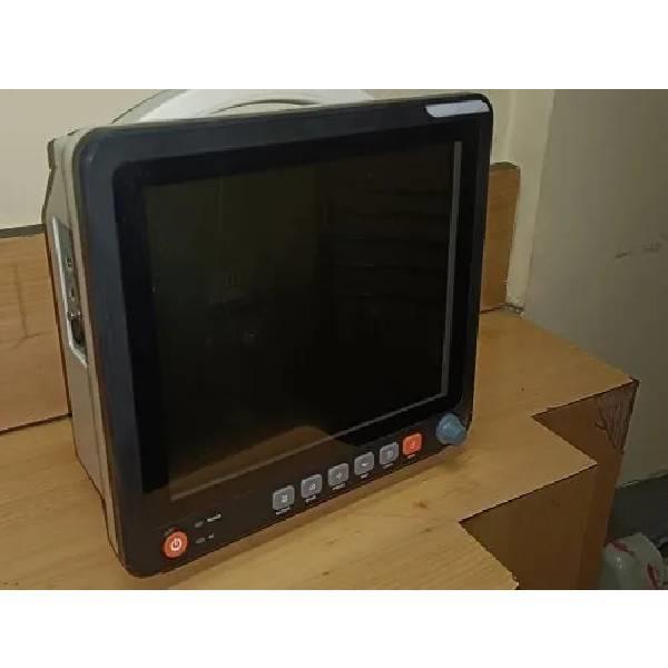 12.1" LCD touch display. Measures SPO2, Temperature, ECG, RESP, NIBP. Supports pediatric, adult, and neonatal patients. Features 12-lead ECG with interpretation.