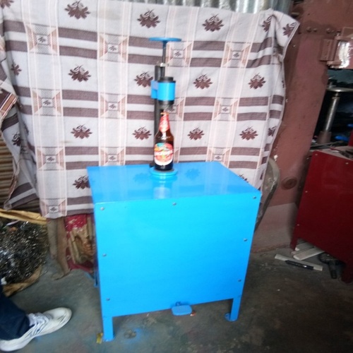 Foot-driven pedal crown corking machine for bottle sealing. Features SS and mild steel construction. Capping speed 15 bottles/min, capacity 17-20 bottles/min, 100 KG weight.