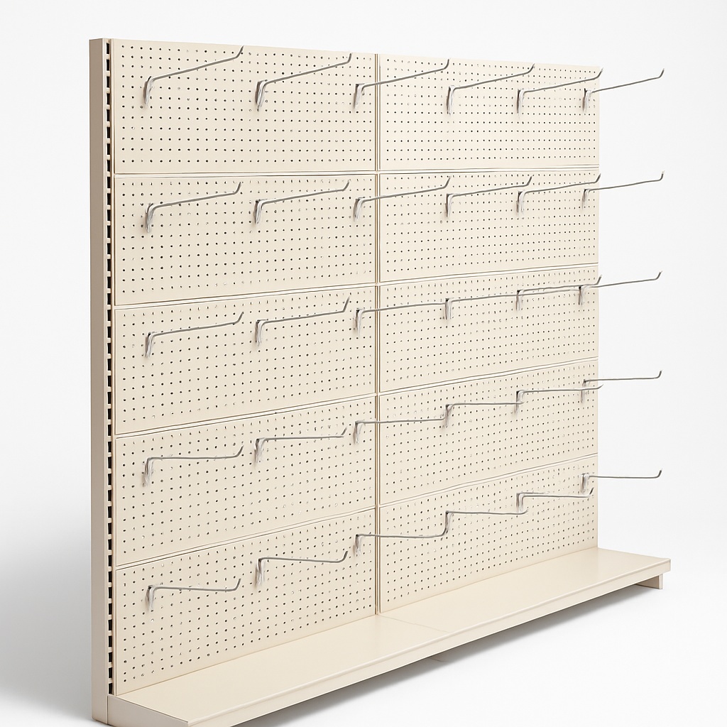 Powder-coated mild steel wall-mounted rack for departmental stores. Features hooks for organized display. Assembly required. Made in India.