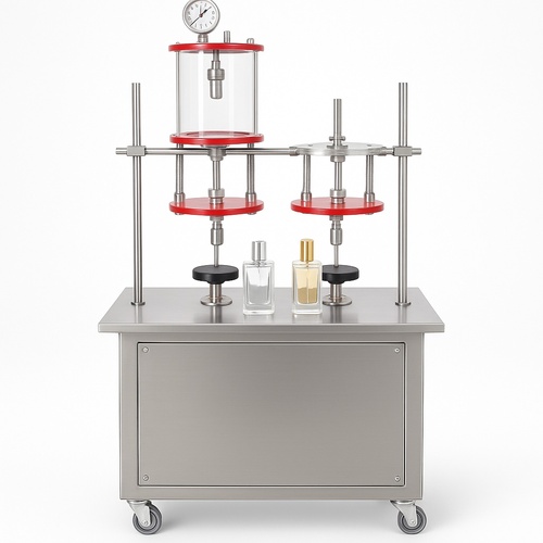 Stainless steel perfume filling machine with 2 heads. Fills 5ml to 100ml at 30-40 bottles per minute. Requires 1Kg compressed air.