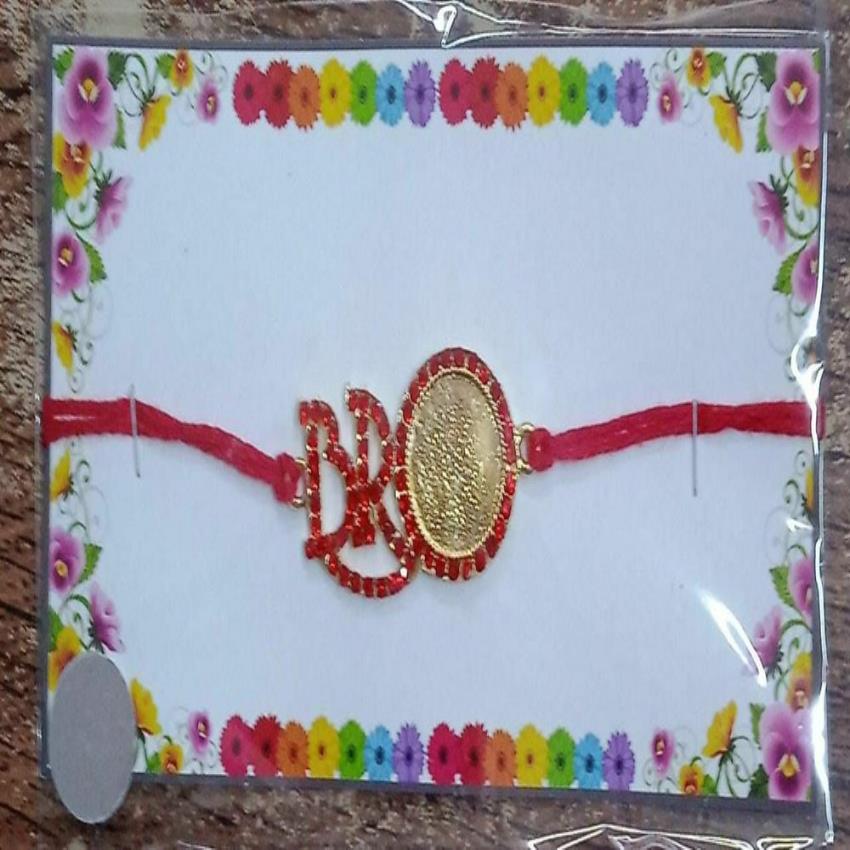 Custom, handmade beaded Rakhi for personal use. Features a metal base and red beads, packaged in a box. Made in India.